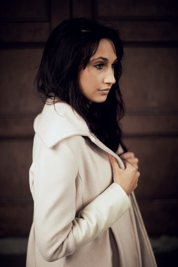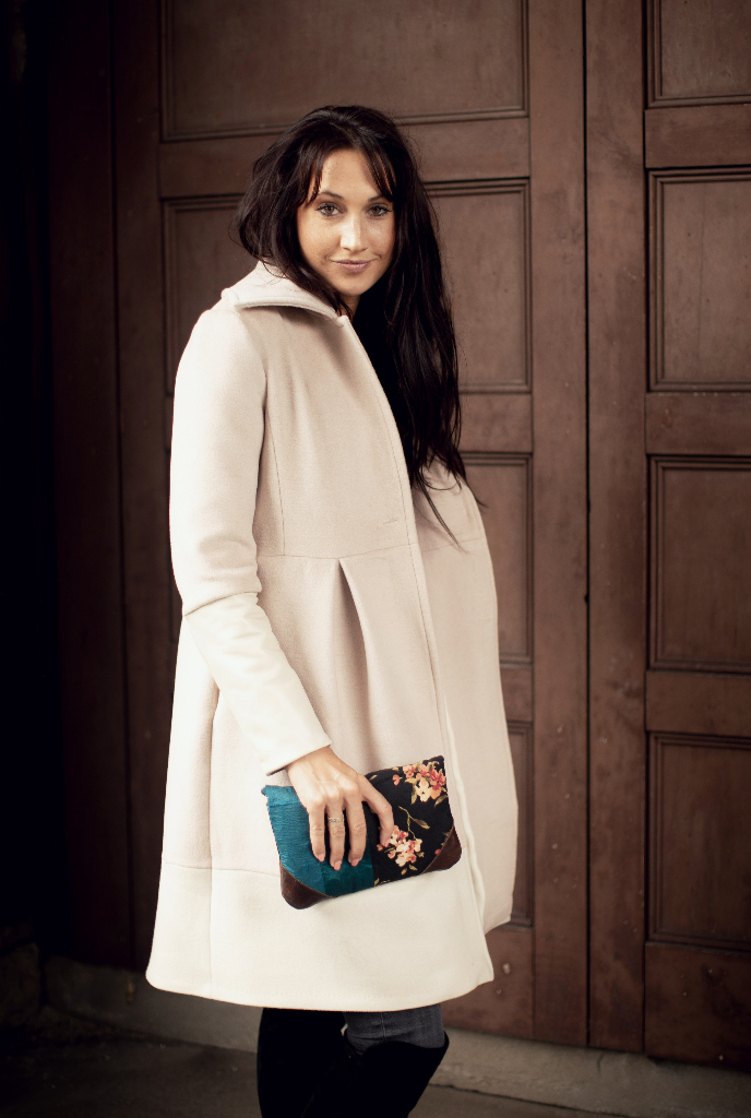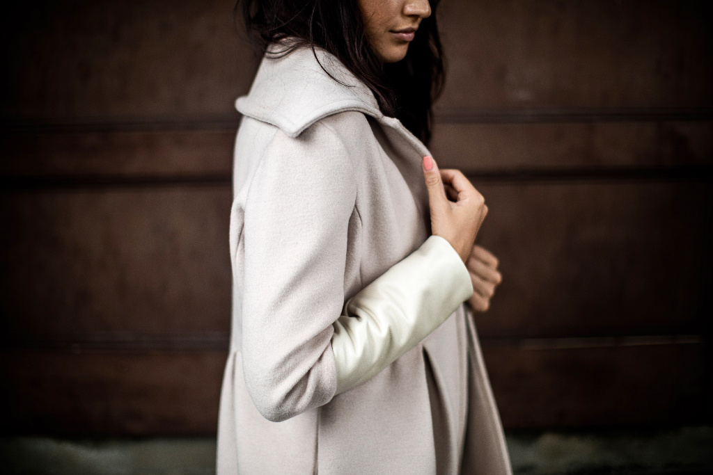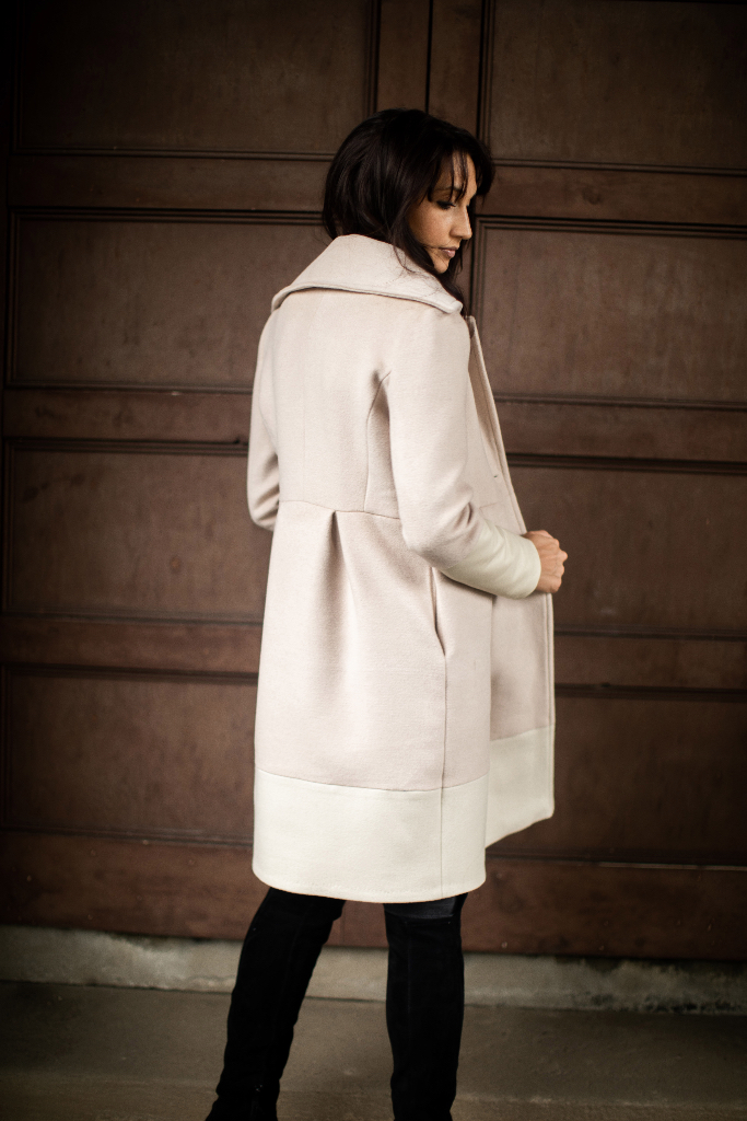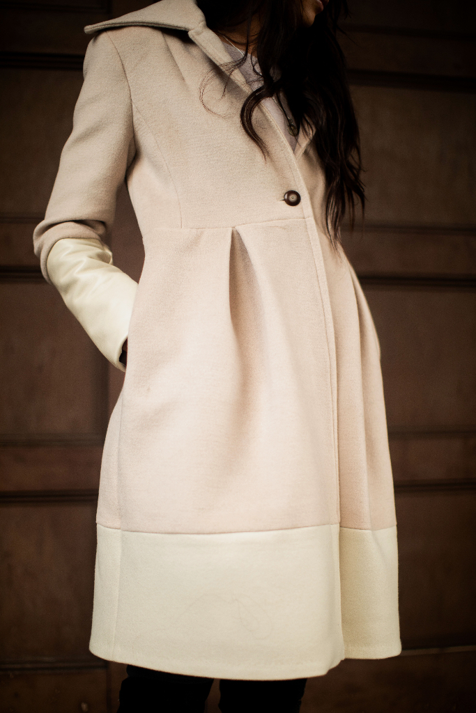 I am going to share some of these expe­ri­ences with you through some new projects. Today I begin with: Cham­pagne Wool & White Leather Col­or Block Women’s Coat.