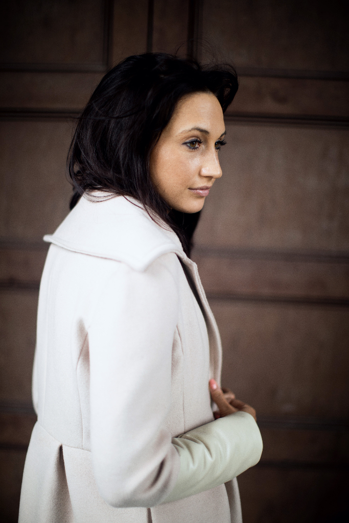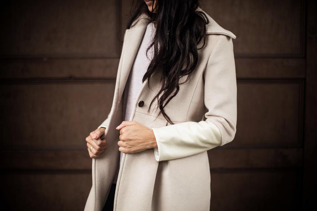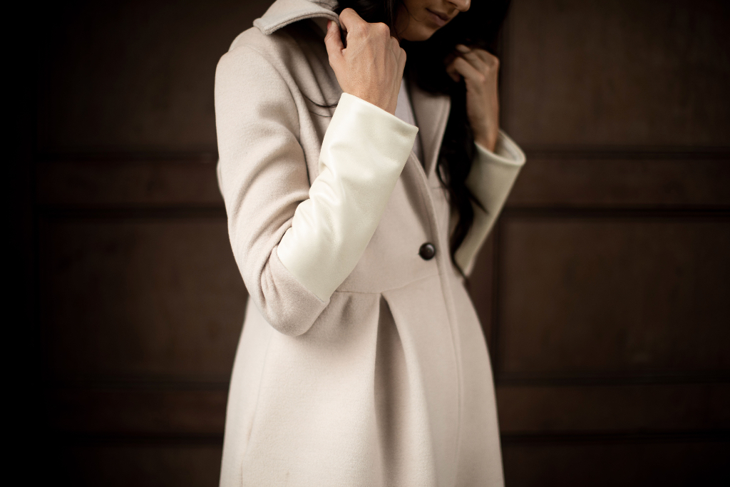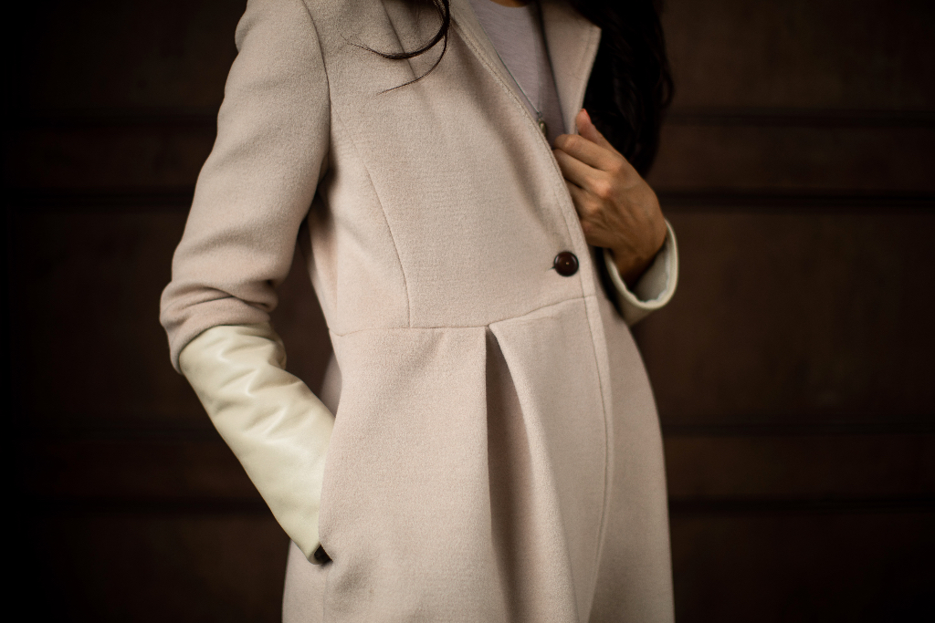I am going to share some of these experiences with you through some new projects. Today I begin with: Champagne Wool & White Leather Color Block Women’s Coat.
