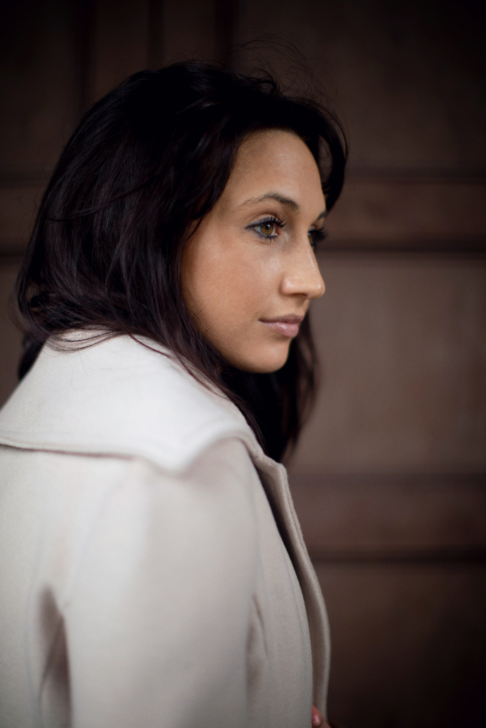 This high-quality coat is made of 100% champagne and white wool with real leather cuffs.
